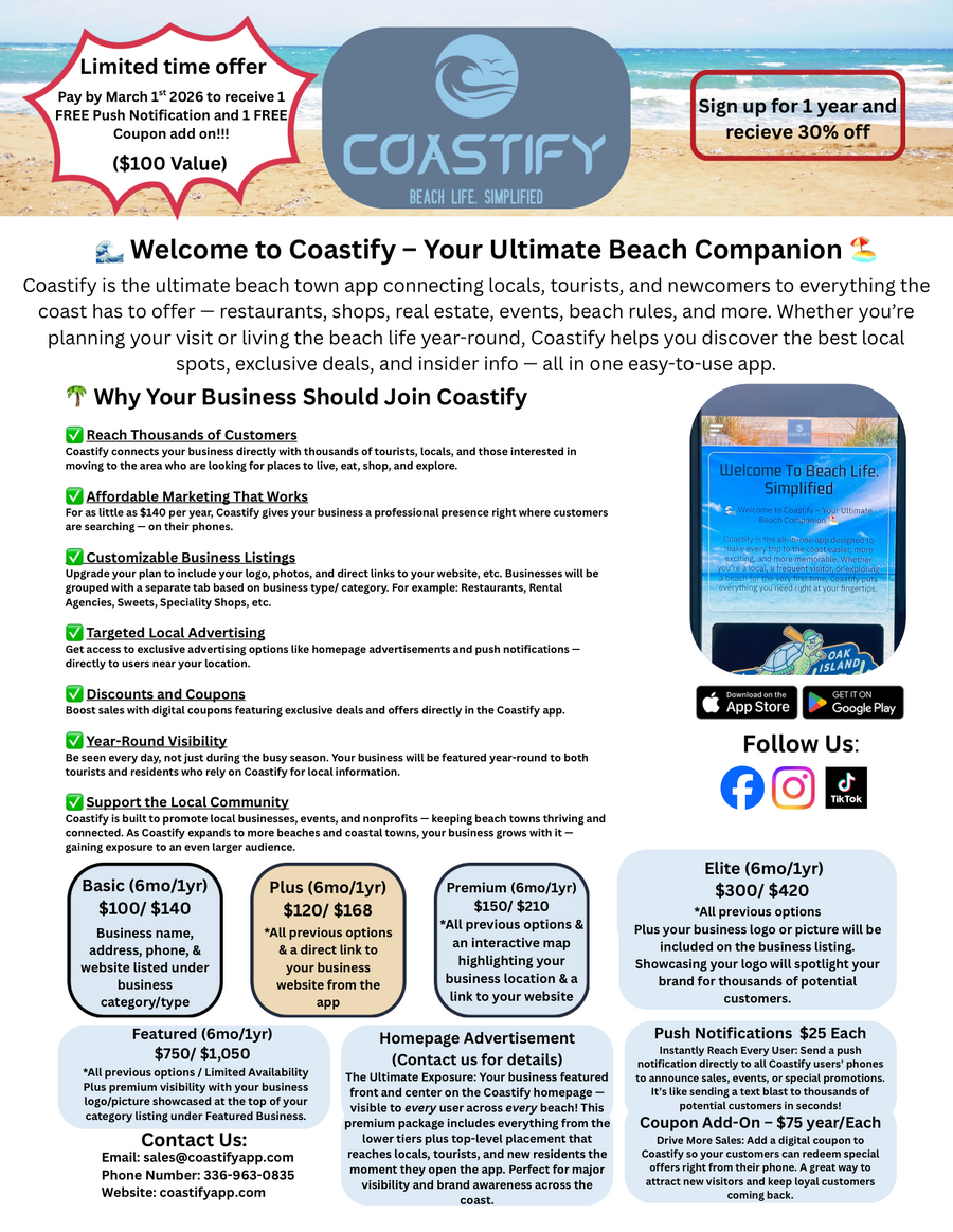 Coastify is built to promote local businesses, events, and nonprofits β keeping beach towns thriving and connected. As Coastify expands to more beaches and coastal towns, your business grows with it β gaining exposure to an even larger audience.